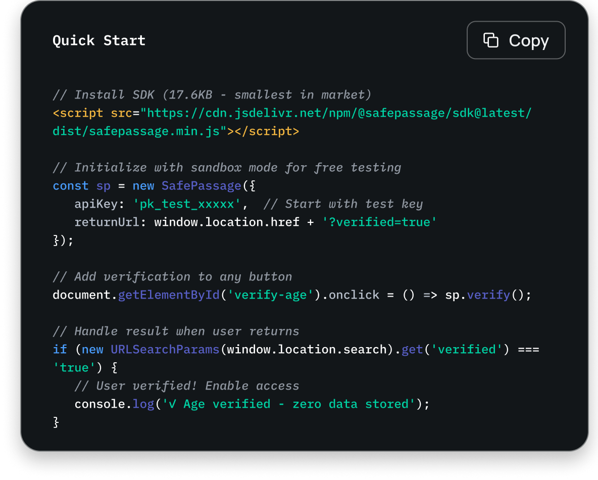 The smallest, fastest age verification SDK on the market. Frontend or server-side, built for fast rollout with full control.